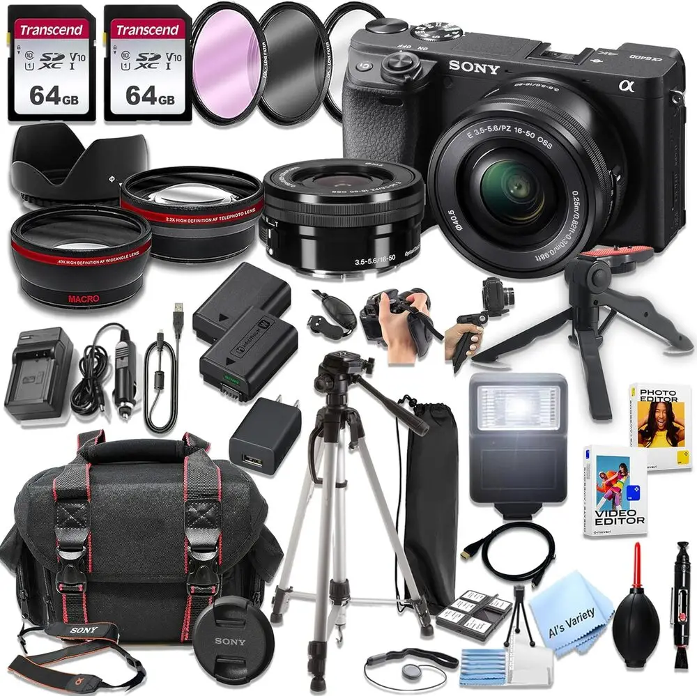 Built-In Media | Sony Alpha a6400 Mirrorless Digital Camera Body, 2pc Transcend 64GB Class 10 SD Memory Card, 40.5mm Filter Kit, 40.5mm Wide angle Aux lens, 40.5mm Telephoto Aux Lens, 40.5mm Tulip Hood, Tripod, Camera Gadget Bag Case, Replacement Battery and Charger, Gripster tripod, Wrist Grip, Video/Photo Editing Software Pack, Slave Flash, Camera Starter Kit, 1 Year Seller Supplied Warranty |