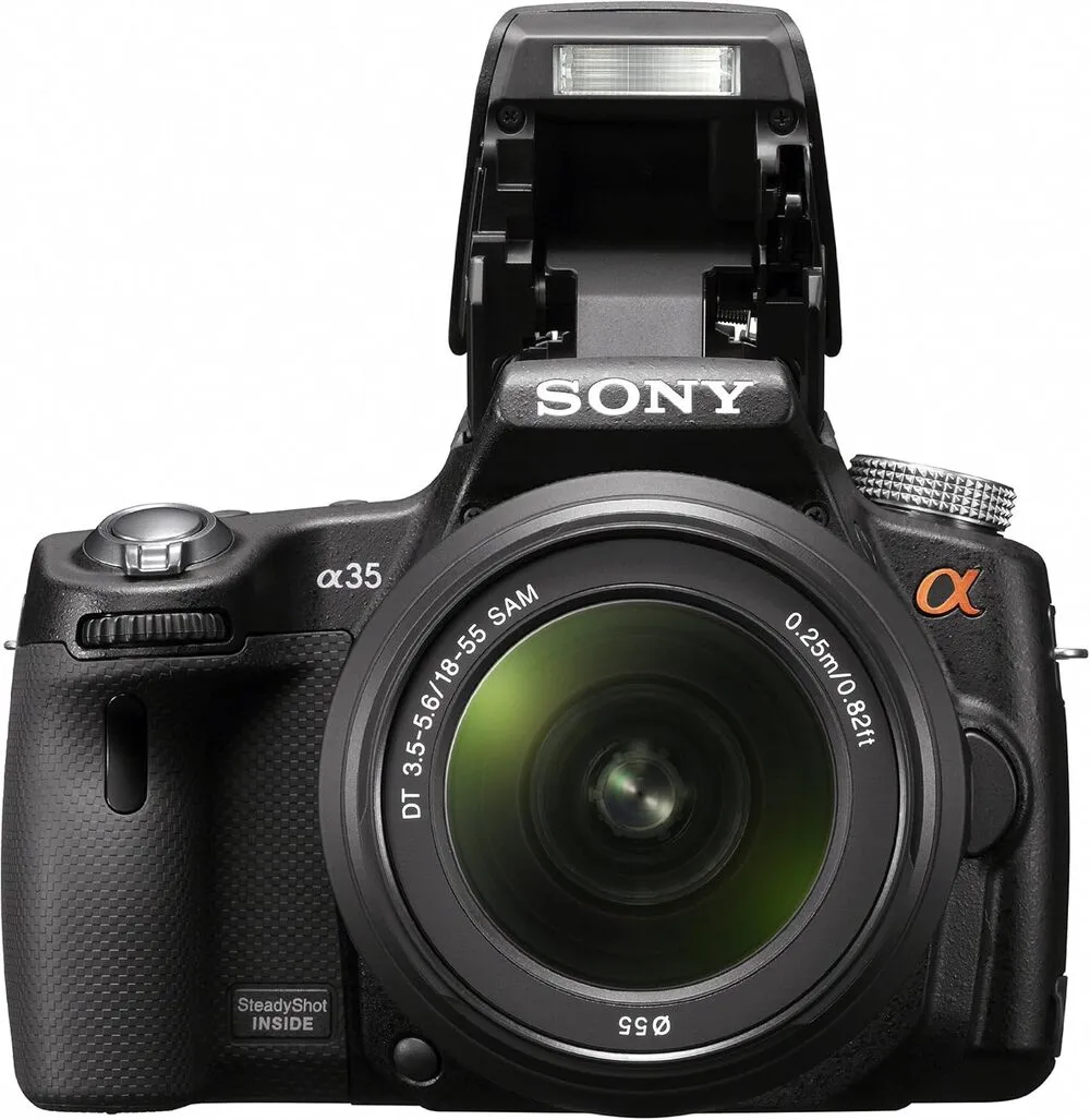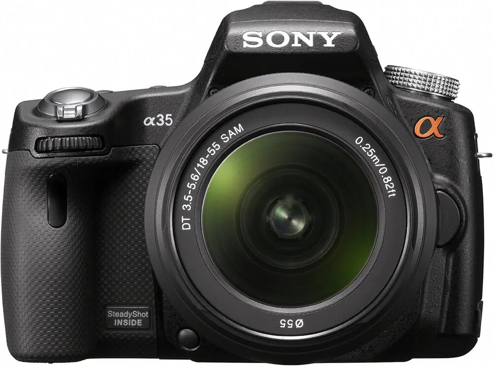 The Sony Alpha SLT-A35 is a digital single-lens translucent (SLT) camera introduced in 2011, leveraging Sony's proprietary translucent mirror technology. This semi-transparent mirror allows simultaneous phase-detection autofocus while capturing images, resulting in faster and more accurate focusing compared to traditional DSLR systems. It features a 16.1 megapixel APS-C sized Exmor CMOS sensor, delivering high-resolution image quality with excellent dynamic range. The camera offers continuous shooting at up to 5 frames per second and full HD video recording capabilities up to 1080i. The electronic viewfinder (EVF) provides clear real-time image preview with exposure and white balance feedback. Additionally, in-body image stabilization aids in reducing blur from camera shake across compatible lenses.