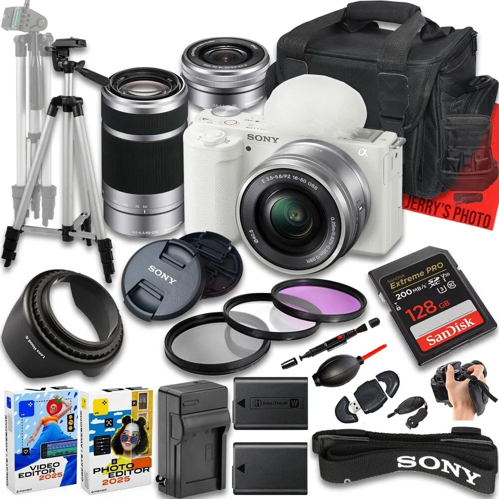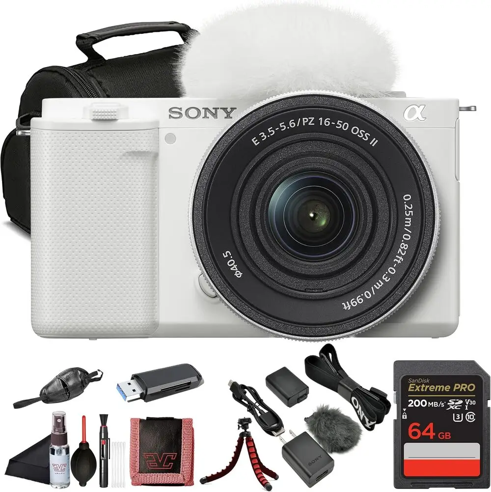 The Sony Alpha ZV-E10 is a mirrorless camera designed specifically for content creators, featuring a 24.2MP APS-C CMOS sensor that delivers high-resolution images and excellent low-light performance. It incorporates Sony's BIONZ X image processor, enabling fast processing speeds and enhanced image quality. The camera supports 4K video recording at up to 30fps with full pixel readout and no pixel binning, ensuring crisp and detailed footage. Autofocus is highly advanced with Real-time Eye AF and Real-time Tracking technologies, facilitating precise focus for both photos and videos. The ZV-E10 offers a fully articulating LCD touchscreen, ideal for vlogging and self-recording. Connectivity options include USB, HDMI, Wi-Fi, and Bluetooth, allowing seamless file transfer and remote control capabilities.