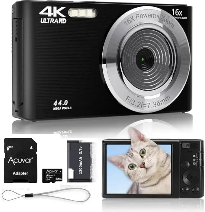The Acuvar 44MP Cam stands out with its ultra-high 44MP sensor delivering detailed, crisp images. Its compact form factor makes it highly portable for everyday photography. The versatile 5x optical zoom covers a wide range of shooting scenarios, from landscapes to portraits. An intuitive LCD touchscreen simplifies user interaction and settings adjustment. Built-in Wi-Fi enables easy image transfer and remote control capability. Long-lasting rechargeable battery ensures extended shooting sessions without interruption.