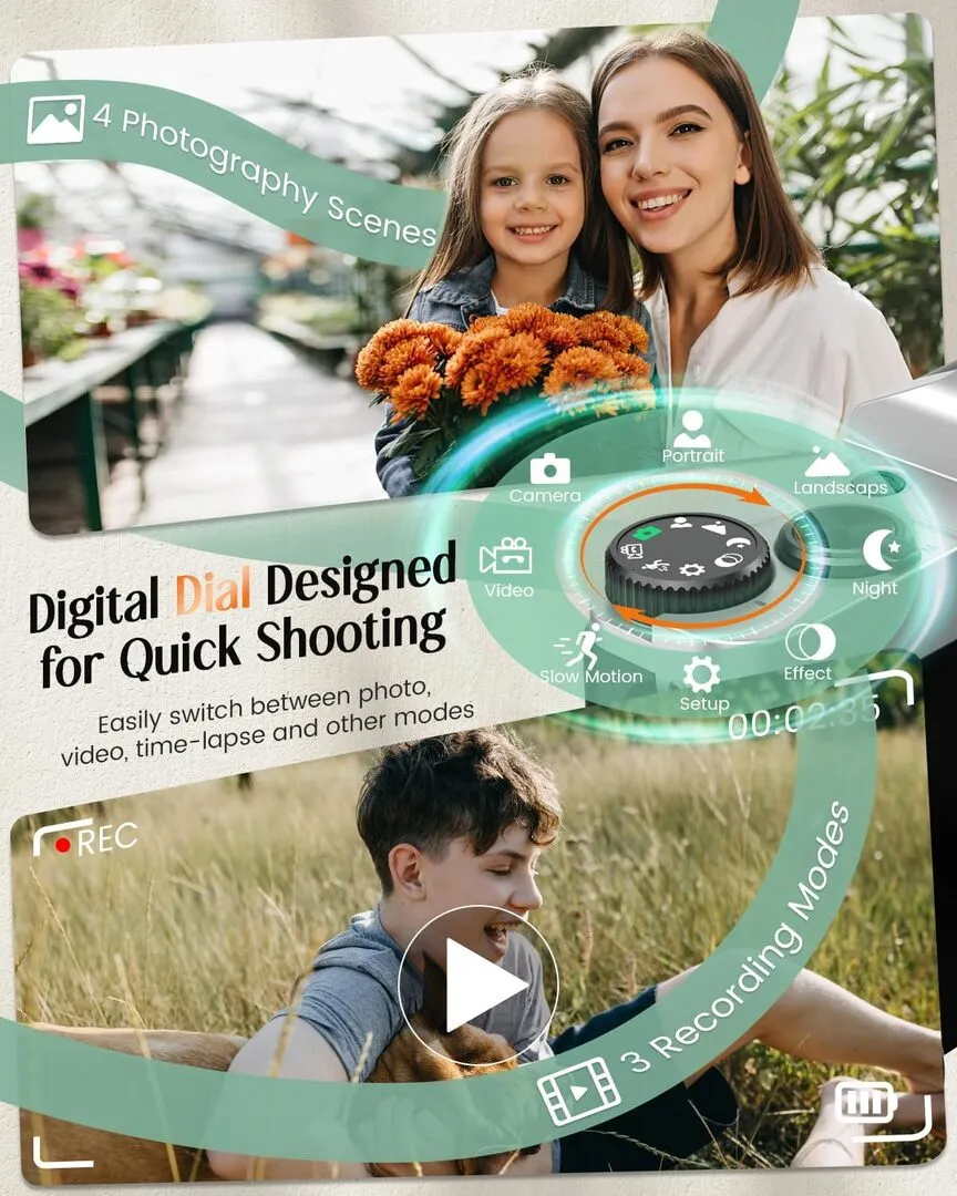 | Shooting Modes | Standard shooting, Continuous shooting, Motion detection, Slow motion, Time-lapse recording |
