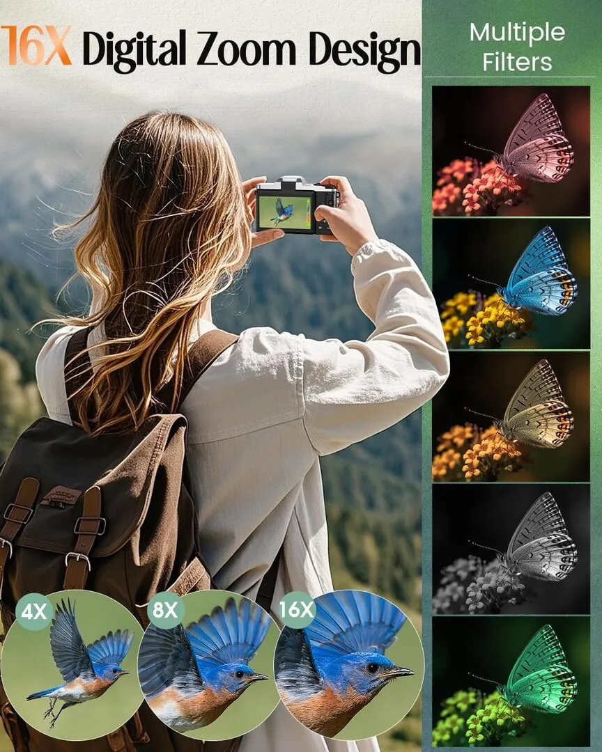 | Built-In Media | 1 x LCD screen cleaning cloth & 1x Camera Wrist Strap, 1x 4K Digital Camera with wifi & 1x 32GB Memory Card, 1x User's Manual & 1x Long Strap & 1x Camera Bag, 2x Rechargeable Batteries & 1x Type C Cable & 1 x Lens Cap |