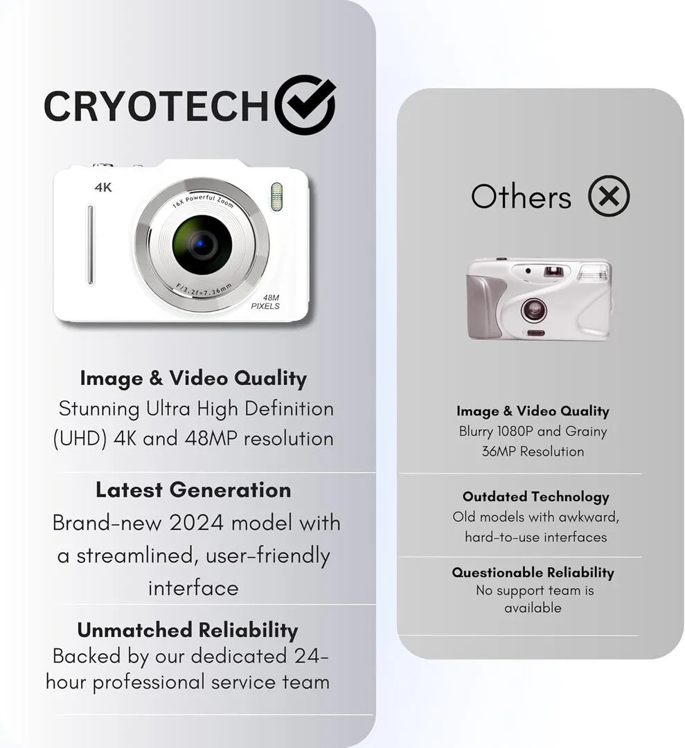 The CRYOTECH 4K Digital H16 is a compact point & shoot camera designed for ease of use and high-resolution imaging. It features a 4K Ultra HD sensor allowing for crisp and detailed photos and videos. The camera integrates a fixed lens optimized for everyday photography, with a wide aperture for diverse lighting conditions. Connectivity options include USB and HDMI ports, enabling straightforward data transfer and external display compatibility. A built-in rechargeable lithium-ion battery supports extended shooting sessions. The device operates with an intuitive menu system accessible via an LCD screen, facilitating seamless control over exposure, white balance, and shooting modes.