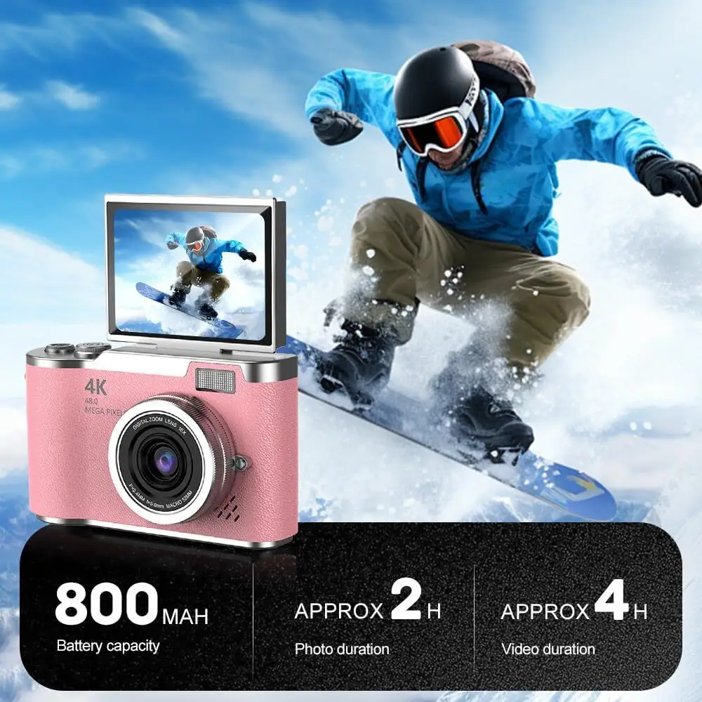 The 4K Foldable Screen Student Camera from Ehnoge boasts a high-resolution 4K image sensor delivering crisp and vibrant video quality. Its innovative foldable screen design provides flexible viewing angles and compact portability. Equipped with advanced autofocus technology, it ensures sharp image capture in various lighting conditions. The camera supports multiple recording formats and offers seamless connectivity options such as Wi-Fi and USB. Its lightweight chassis enhances portability, making it ideal for on-the-go users, especially students. The integrated battery supports extended recording times for uninterrupted filming sessions.