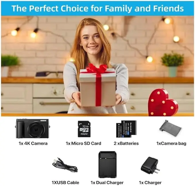 Built-In Media | 1* 4K Digital Camera & 1* 32GB Card & 1* Camera Lens Cap, 1* Camera Wrist Band & 1* Camera Bag & 1* Camera Lens cleaning cloth, 1* Power Cable & 1* User Manual, 2* Rechargeable lithium batteries & 1* Battery Charging Stand |