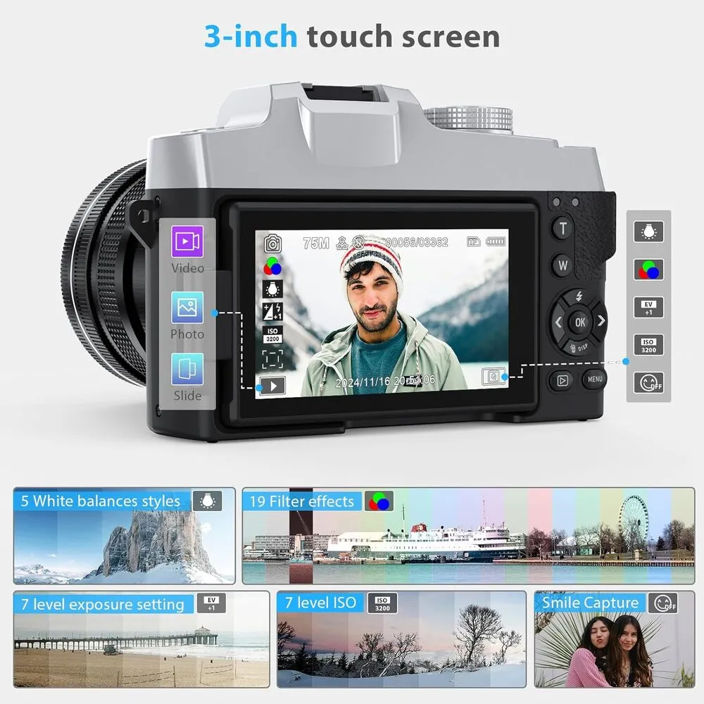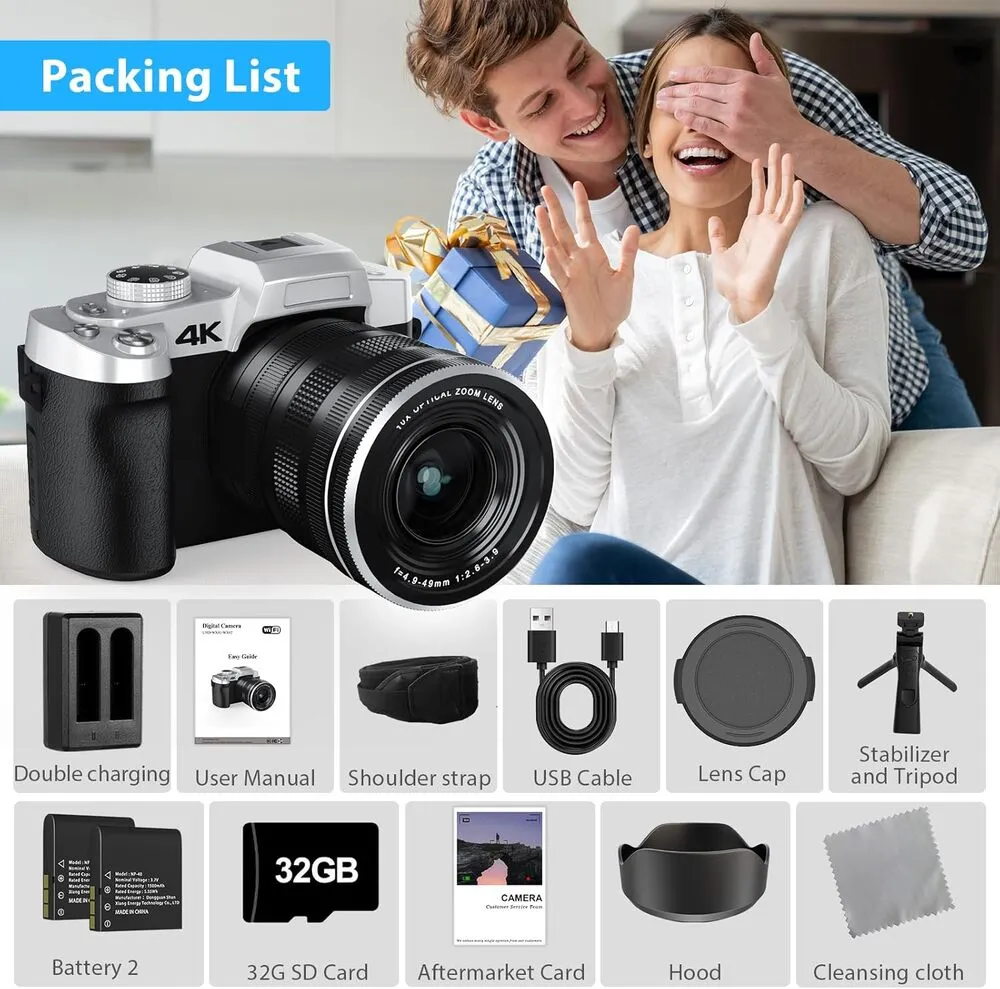 | Built-In Media | 1300mAh battery*2, Dual Charger*1, Manual * 1, 32GB TF card*1, Type C Cable * 1, 4K Digital camera*1, Shoulder Strap * 1, Combined Tripod Grip & Remote * 1, Lens Hood*1, Lens Cap*1, Cleaning Cloth * 1 |