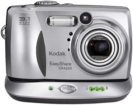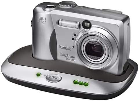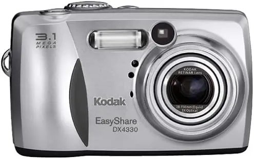 The KODAK DX4330 is a fixed-lens digital camera released in 2004, belonging to the DX series. It features a 4.2-megapixel CCD sensor which provides moderate resolution suitable for typical consumer photography. The lens is a Schneider-Kreuznach 3x optical zoom lens with a focal length of 6.3-18.9 mm, equivalent to 38-114 mm in 35 mm terms. The camera supports multiple exposure modes and offers ISO speeds ranging from 80 to 1600, with adjustable white balance settings. It stores images primarily on SD memory cards and supports JPEG image format. The interface includes a 1.8-inch LCD display for image preview and camera settings. The camera employs AA batteries to power its lightweight body.