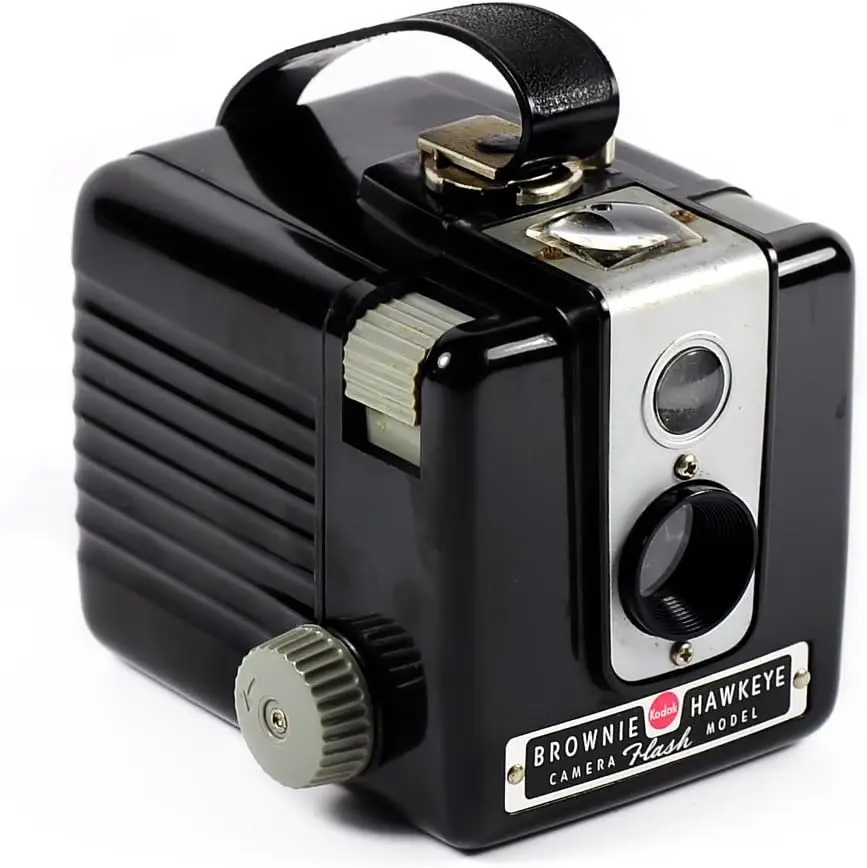 The Vintage Kodak Brownie Hawkeye is a classic medium format box camera introduced in 1950 by Kodak. It features a simple fixed-focus 80mm f/8 lens coupled with a single-speed shutter, optimized for straightforward snapshot photography. The camera uses 620 roll film to produce 6x9 cm exposures, delivering large negatives for detailed images. Its viewfinder is a simple waist-level optical finder with a bright frame line. The design relies on mechanical operation with no batteries required, emphasizing durability and ease of use. This camera represents mid-20th century technology focusing on accessibility and simplicity for amateur photographers.