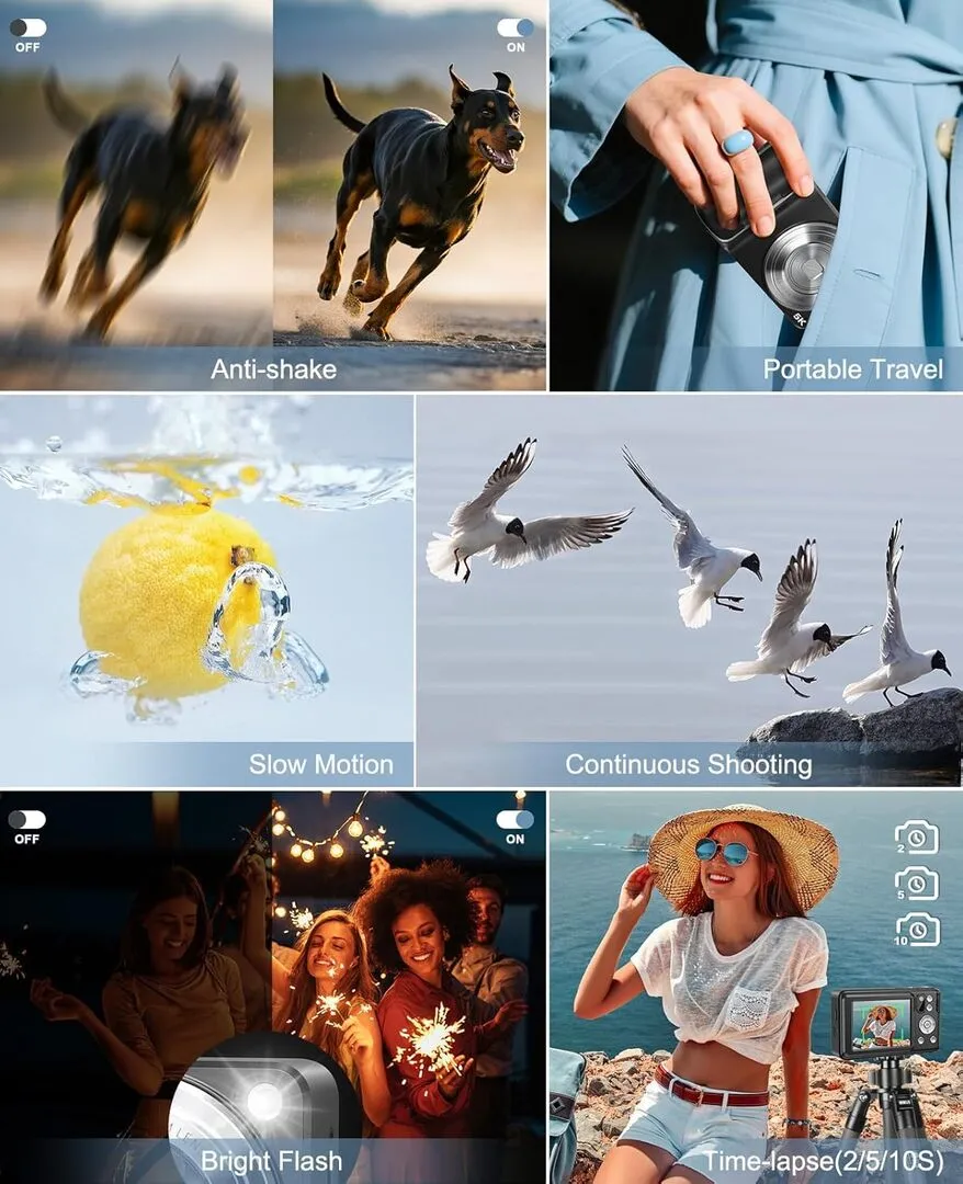 | Special Feature | WiFi Transfer, Touchscreen, 6X Optical Zoom, Telescopic Lens, Digital Camera for Photography and Video, Autofocus, Anti-Shake, Webcam, Small Travel Camera, Hot Shoe, Bright Flash, Selfie Dual-lens Vlogging Camera for YouTube, Self Timer, Time-lapse, Slow Motion Recording, Gift |