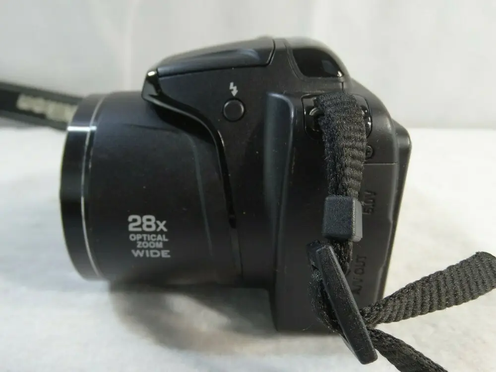 The Nikon Coolpix L340 offers impressive 28x optical zoom that caters to versatile shooting distances, from wide-angle to telephoto. Its 20.2-megapixel CMOS sensor delivers sharp images with good color reproduction. The camera's ergonomic grip makes it user-friendly and comfortable to hold during extended use. The 3-inch LCD screen is clear and responsive, enhancing user interaction. Use of AA batteries ensures that users can conveniently replace batteries anywhere without requiring proprietary chargers. The lightweight and compact design make it suitable for travel and casual photography.