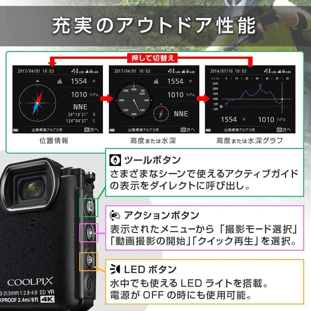 The Nikon W300OR is a compact digital camera designed specifically for rugged outdoor activities. It integrates a 16-megapixel BSI CMOS sensor with Nikon's EXPEED image processing engine, providing excellent image quality in various lighting conditions. The 5x optical zoom lens covers a versatile focal range suitable for wide-angle landscapes and moderate telephoto shots. The camera is waterproof up to 30 meters, shockproof, freezeproof, and dustproof, making it highly durable for extreme environments. It supports 4K UHD video recording at 30fps and full HD slow-motion capture at 120fps. Built-in GPS, Wi-Fi, and Bluetooth enable photo geotagging and convenient wireless sharing.