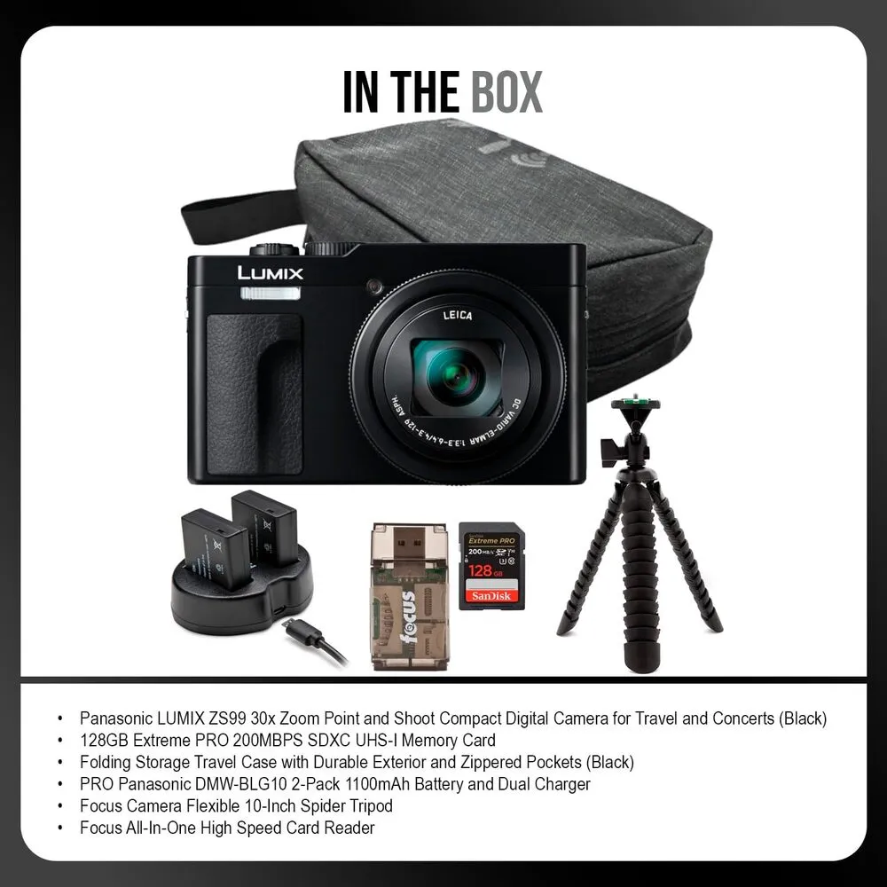The Panasonic LUMIX ZS99 is a high-performance compact travel zoom camera featuring a 1-inch MOS sensor that delivers impressive image quality. Equipped with a 24-360mm equivalent zoom lens, it offers versatile shooting capabilities suitable for various photographic situations. It supports 4K video recording and includes 4K Photo mode to capture high-resolution stills from video footage. The camera features an integrated electronic viewfinder and a tilting rear LCD screen for flexible composition angles. It incorporates advanced autofocus systems and optical image stabilization technology for sharp images even in challenging conditions.