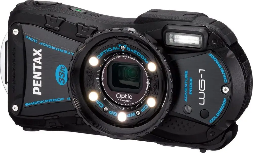 The WG-1's standout advantage is its comprehensive ruggedness, featuring waterproof, shockproof, and freezeproof capabilities unmatched in many compact cameras of its time. Its wide-angle 5x zoom lens provides flexibility for various shooting scenarios, especially outdoor landscapes and underwater wildlife. The camera supports Full HD video with stereo sound, appealing to users requiring video capabilities alongside still images. Its compact size combined with a durable magnesium alloy body offers portability without sacrificing toughness. The PRIME II image processor enhances image quality significantly, reducing noise especially at higher ISO levels. Additionally, the inclusion of multiple shooting modes tailored to specific environments such as underwater and macro expands creative potential for users.