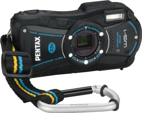 The Pentax Optio WG-1 is a rugged compact digital camera designed for outdoor and underwater use, featuring a durable magnesium alloy body that is waterproof up to 10 meters, shockproof from 1.5 meters, and freezeproof to -10°C. It employs a 12.1-megapixel CCD sensor combined with a wide-angle 5x optical zoom lens covering 28-140mm (35mm equivalent). The camera supports full HD 1080p video recording at 30 fps and offers in-camera image stabilization to reduce blur in challenging environments. It features a 2.7-inch high-brightness LCD screen with anti-reflective coating for improved visibility in sunlight. Connectivity includes USB 2.0 for image transfer and AV out for video playback, while power is provided by a rechargeable lithium-ion battery enabling extensive shooting sessions.