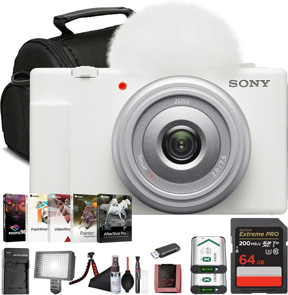 The Sony ZV-1 is a compact, high-performance point & shoot digital camera designed specifically for content creators and vloggers. It features a 1.0-type stacked CMOS sensor with 20.1 megapixels, enabling high-resolution imaging and excellent low-light performance. The camera is equipped with a fast ZEISS Vario-Sonnar T* 24-70mm equivalent f/1.8-2.8 lens, providing wide aperture for beautiful bokeh effects and sharp images.
