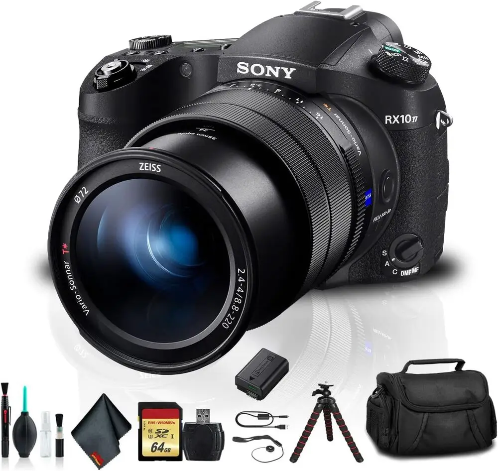 The Sony RX10 IV (model DSCRX10M4/BRE) is a high-performance bridge camera designed with a 1-inch stacked CMOS sensor that provides high-resolution 20.1MP still images and 4K video capture with full pixel readout and no pixel binning. It features a ZEISS Vario-Sonnar T* 24-600mm equivalent zoom lens with a fast f/2.4-4 aperture range, delivering superior optical quality throughout the zoom range. The BIONZ X image processor combined with the front-end LSI ensures rapid processing speeds for high-speed continuous shooting up to 24fps and quick autofocus calculations.