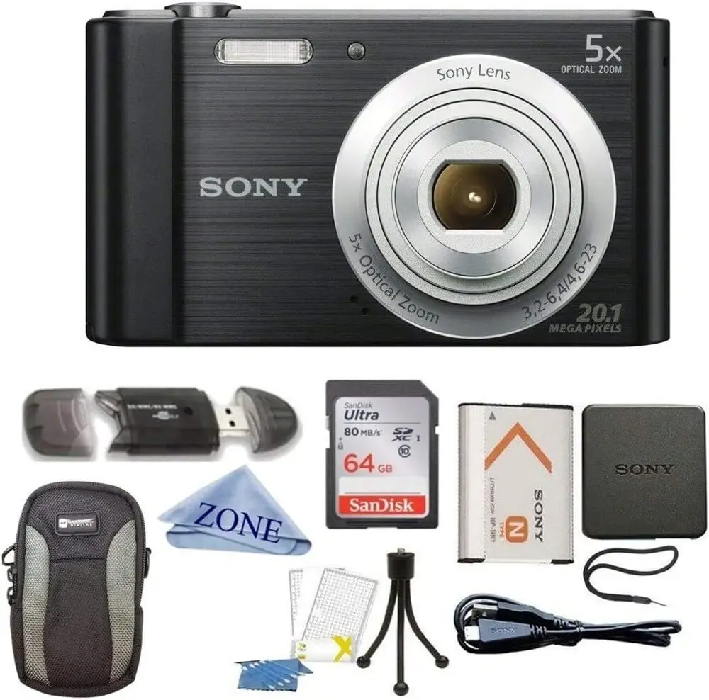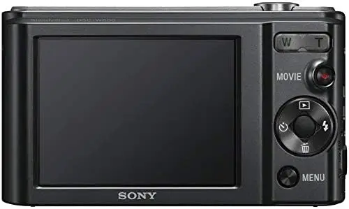 The Sony W800 is a compact digital camera featuring a 20.1-megapixel Super HAD CCD sensor enabling high-resolution image capture. It incorporates a 5x optical zoom Carl Zeiss lens that provides flexibility for shooting from wide-angle to telephoto perspectives. The camera supports 720p HD video recording at 30 frames per second, catering to casual videography needs. Its ISO sensitivity ranges from 100 to 3200 to accommodate various lighting conditions. The W800 employs Intelligent Auto mode to optimize camera settings automatically for ease of use. Power is provided by AA batteries, making it convenient to replace on the go.