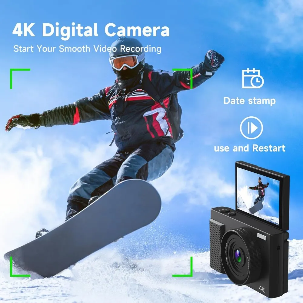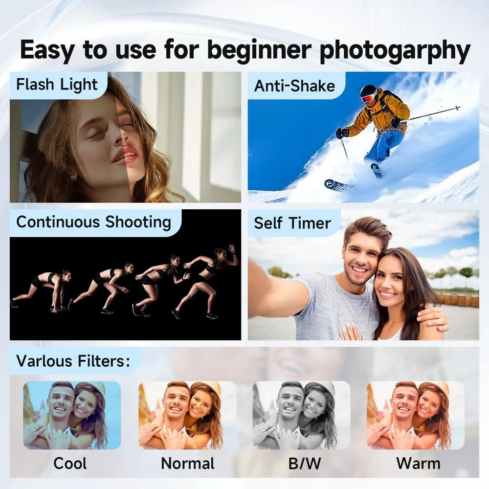 Camera Lens | This digital camera features a versatile lens with 16X digital zoom, offering a wide angle of view and advanced capabilities such as anti-shake, time-lapse, and slow-motion. It is ideal for vlogging, travel photography, and capturing detailed moments. |