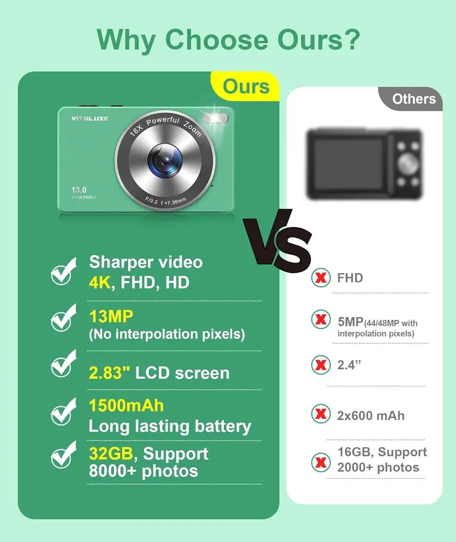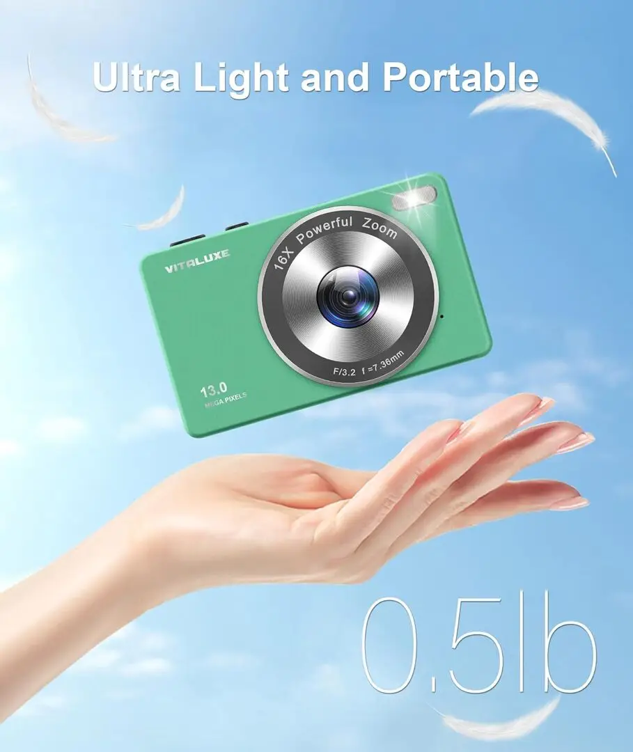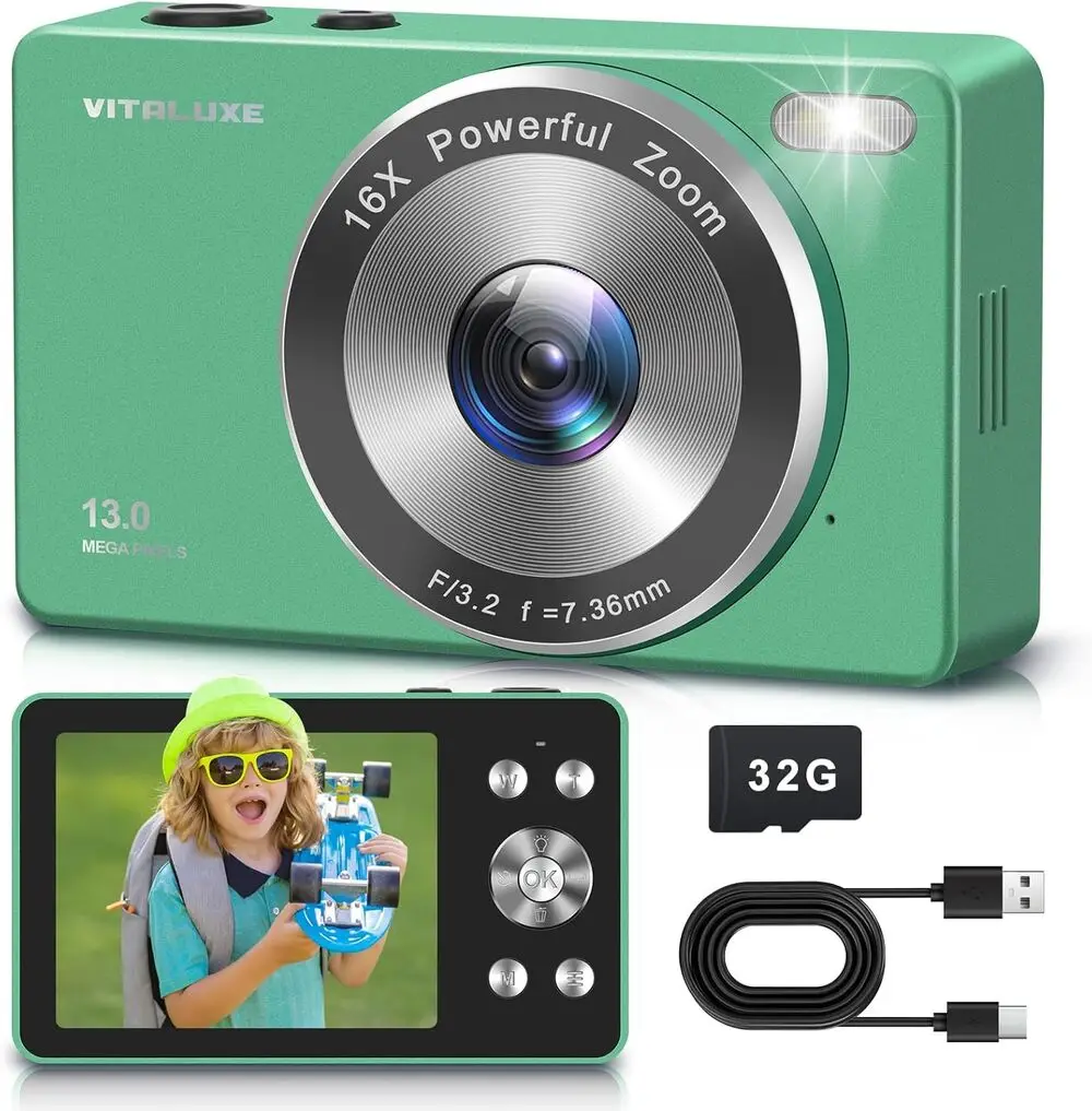 The VITALUXE DCP100 is a compact point & shoot digital camera tailored for beginners and children. It employs a 3.2-megapixel CCD sensor providing sufficient image resolution for casual photography. The camera features a fixed focal length lens with basic zoom capabilities suitable for simple framing. Powered by AA batteries, it offers portability and ease of use without complicated power management. Storage is supported via SD card slots allowing expandable memory for photo storage. Connectivity includes USB transfer for quick downloading of images to computers, making it an accessible and user-friendly device for new photographers.