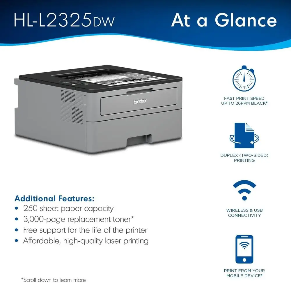 The HL-L2325DW offers fast printing speeds up to 30 ppm, reducing waiting times for document output. Its wireless connectivity enables flexible placement without cabling constraints. Automatic duplex printing helps lower operational costs by cutting paper usage. The 250-sheet input tray allows for extended print runs before reloading paper. High print resolution ensures sharp, professional-quality text and graphics. Compact footprint and quiet operation make it suitable for shared office environments.