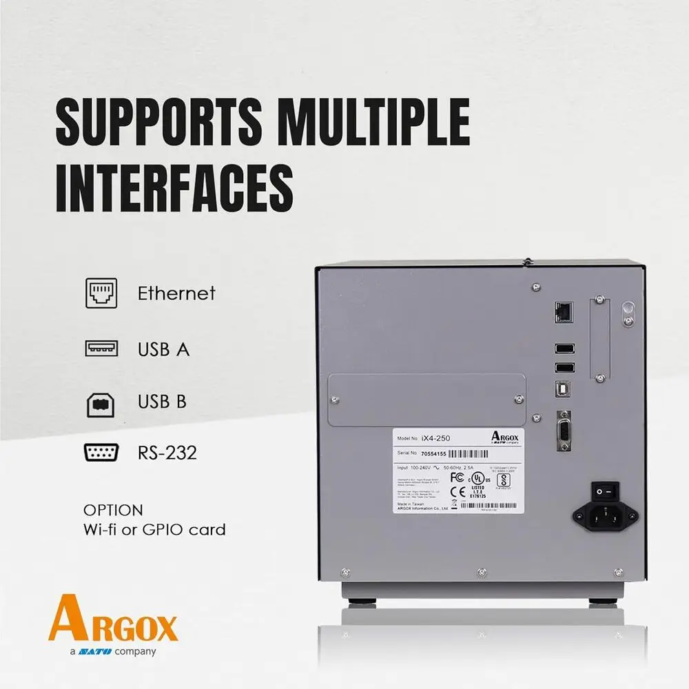 The ARGOX IX4-250 is an industrial-grade label printer engineered for professional office environment applications requiring reliable barcode and label printing. It features a thermal transfer mechanism providing high-resolution print quality up to 203 dpi, suitable for small to medium batch label production. The printer supports a maximum print width of 4.25 inches and a print speed of up to 7 inches per second, ensuring efficient throughput. Constructed with a rugged metal chassis, the IX4-250 guarantees durability under continuous usage. It includes comprehensive connectivity options including USB 2.0, Ethernet, and serial ports facilitating easy integration with various office systems. The device is compatible with multiple label types and sizes, enhancing its versatility across labeling tasks.