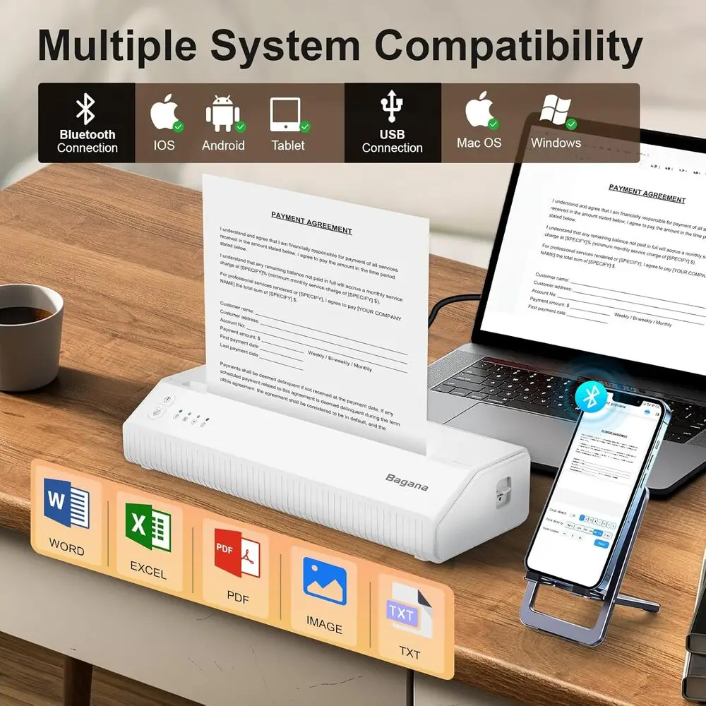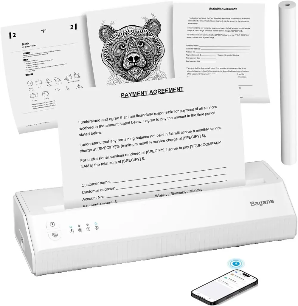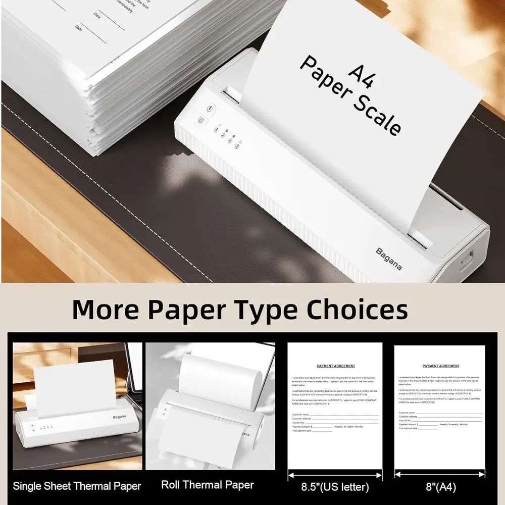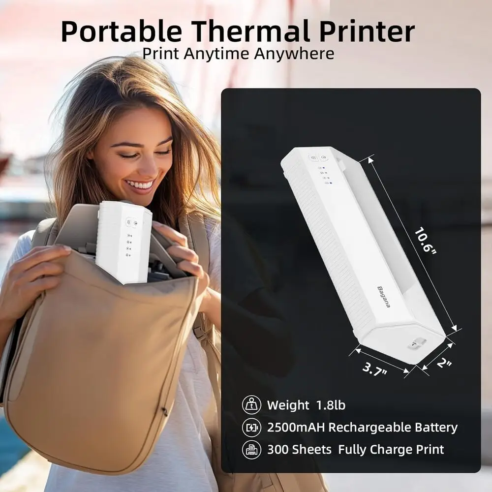 Included Components | 1 Roll US Letter Thermal Paper, Bagana Portable Thermal Printer, Type-C to USB Adapter, USB-A to USB-C charging cable, User Manual |