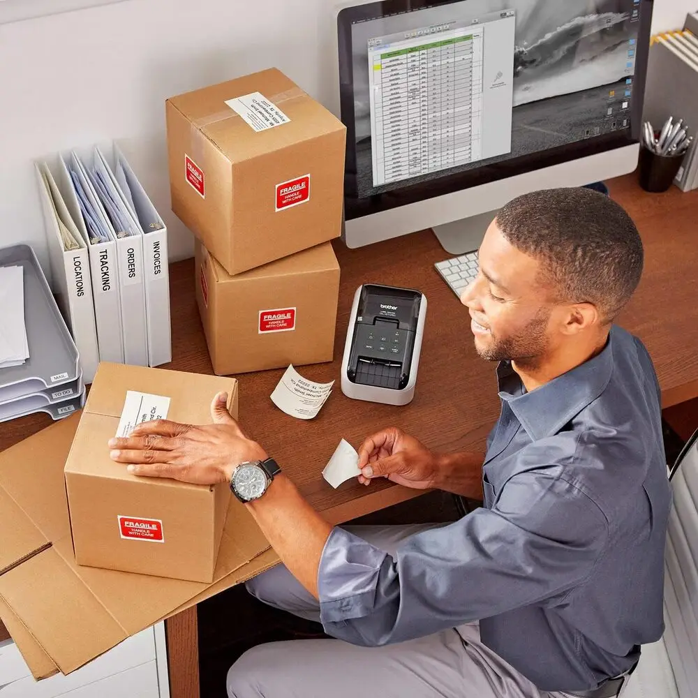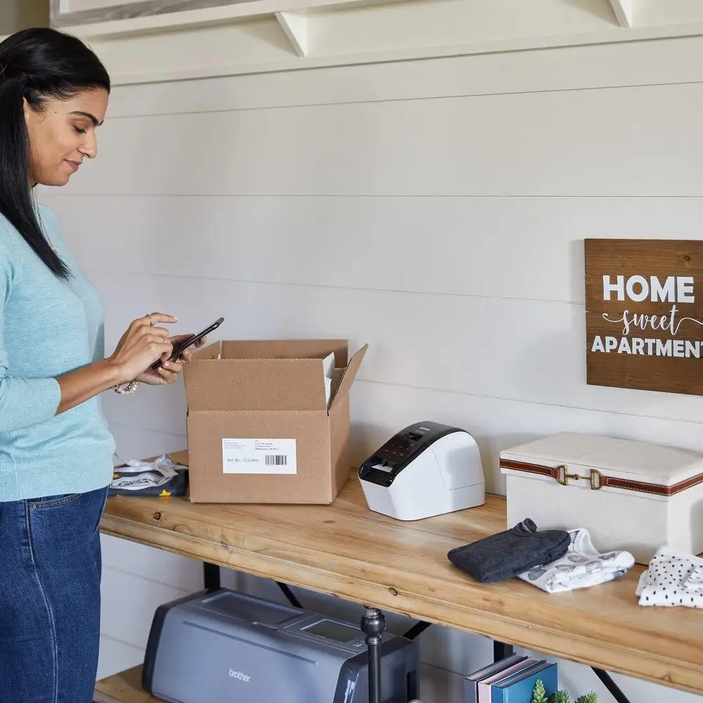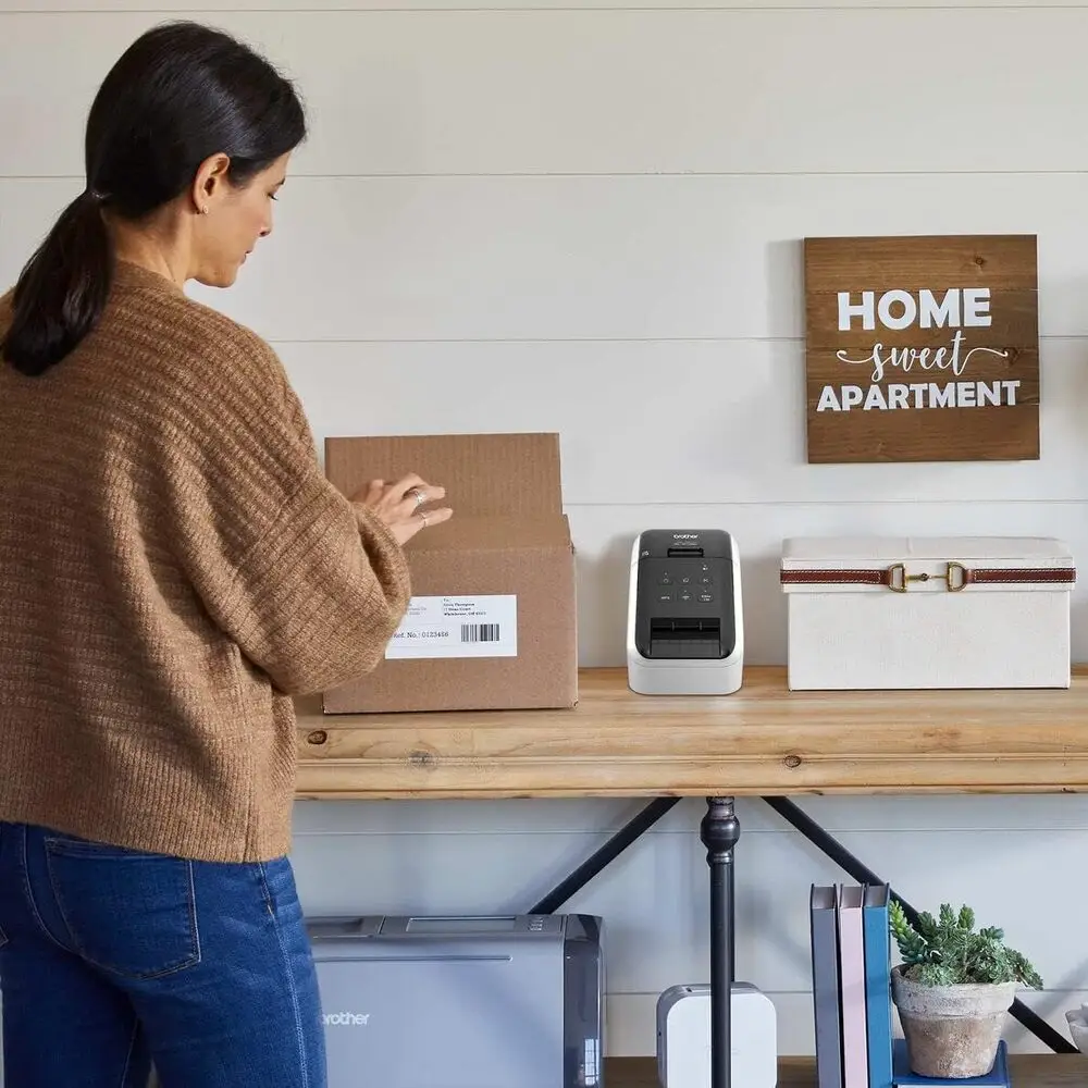It uses Brother DK label rolls, which come in various sizes for different labeling needs.