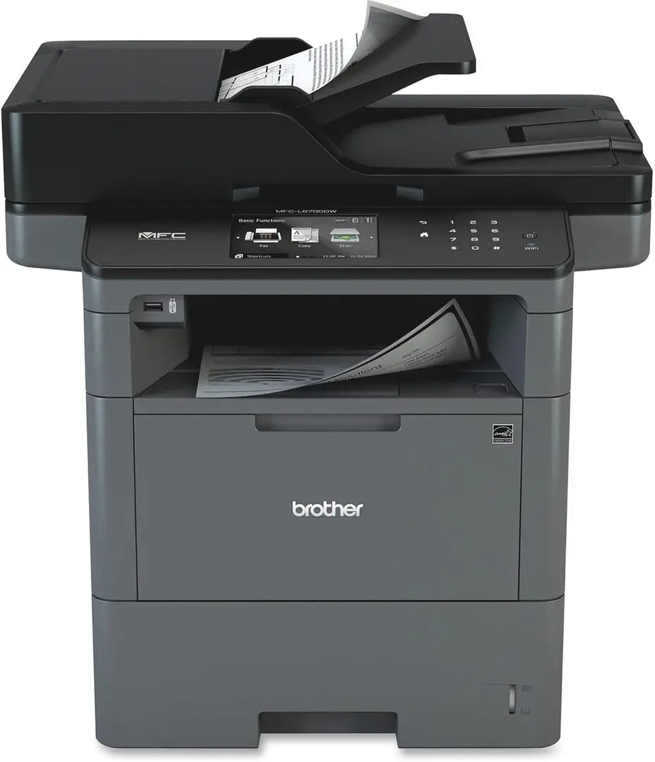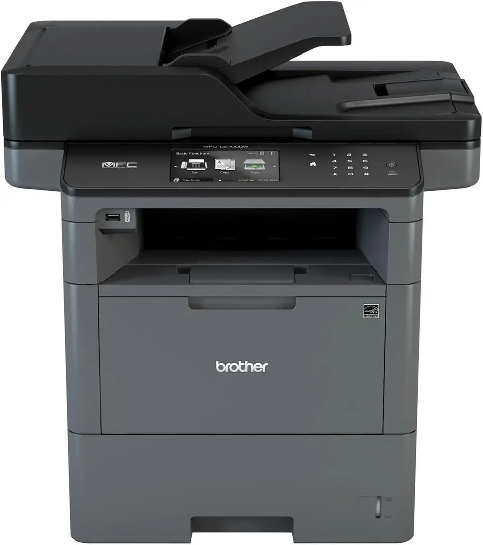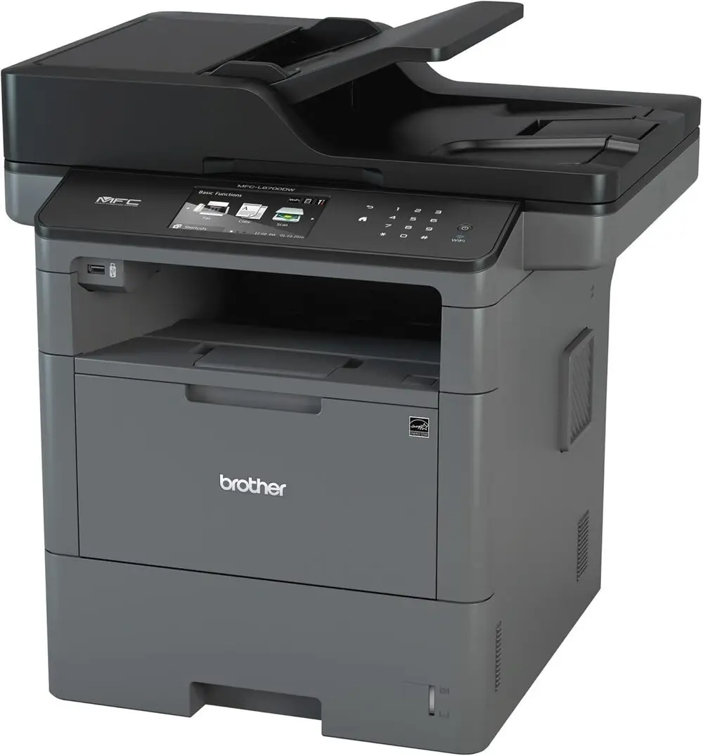 The Brother MFC-L6700DW is a high-performance monochrome laser multifunction printer designed for office environments requiring reliable, fast, and efficient document handling. It features a 1 GHz dual-core processor and 512 MB of RAM, supporting print speeds up to 42 pages per minute. Connectivity options include wireless 802.11b/g/n, Ethernet, and USB 2.0, allowing flexible integration into various network setups. The device supports automatic duplex printing, scanning, copying, and faxing with a 70-page capacity automatic document feeder. The MFC-L6700DW uses Brother's TN-850 high-yield toner cartridges, ensuring economical operation. It also includes a 250-sheet paper tray and a 50-sheet multi-purpose tray, catering to diverse media types and sizes for versatile office productivity.
