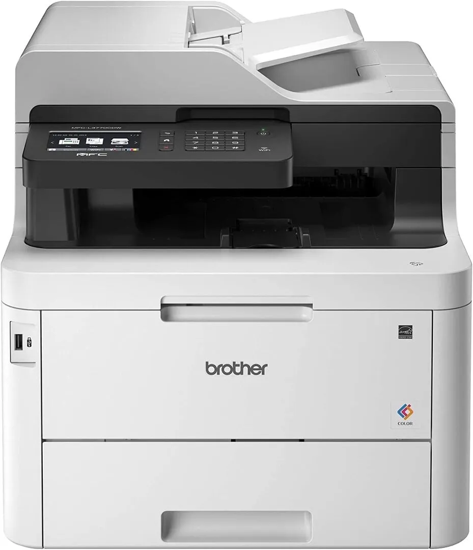 The Brother MFC-L3770CDW is a compact all-in-one color laser printer designed for small to medium office environments. Equipped with a 2.7-inch color touchscreen display for easy navigation, it supports print, scan, copy, and fax functions in a single machine. It features a fast print speed of up to 25 pages per minute for both color and monochrome outputs, driven by a 600 MHz processor with 512 MB RAM, ensuring efficient performance under typical office workloads. Connectivity options include built-in Ethernet, USB 2.0, and wireless interface supporting Wi-Fi Direct, enabling versatile networking setups. The printer uses LED technology with a maximum print resolution of 2400 x 600 dpi, delivering sharp text and vibrant color graphics. It supports automatic two-sided (duplex) printing and scans up to 50-page Auto Document Feeder capacity for batch document processing.