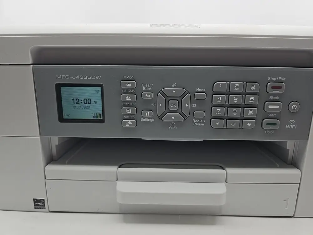 The Brother MFC-J4335DW is an all-in-one inkjet printer designed for efficient office electronics tasks, integrating printing, scanning, copying, and faxing functionalities into a compact footprint. It supports wireless connectivity through Wi-Fi and Wi-Fi Direct, enabling flexible printing from various devices including smartphones and tablets. The printer offers a print resolution of up to 6000 x 1200 dpi, utilizing PrecisionCore technology for sharp, high-quality output. It supports automatic duplex printing to conserve paper and reduce operating costs. The scanner features color CIS (Contact Image Sensor) technology, providing detailed and accurate document scanning at up to 1200 x 2400 dpi resolution. This device utilizes Brother's INKvestment Tank technology, allowing high page yields and cost-effective ink replacement.