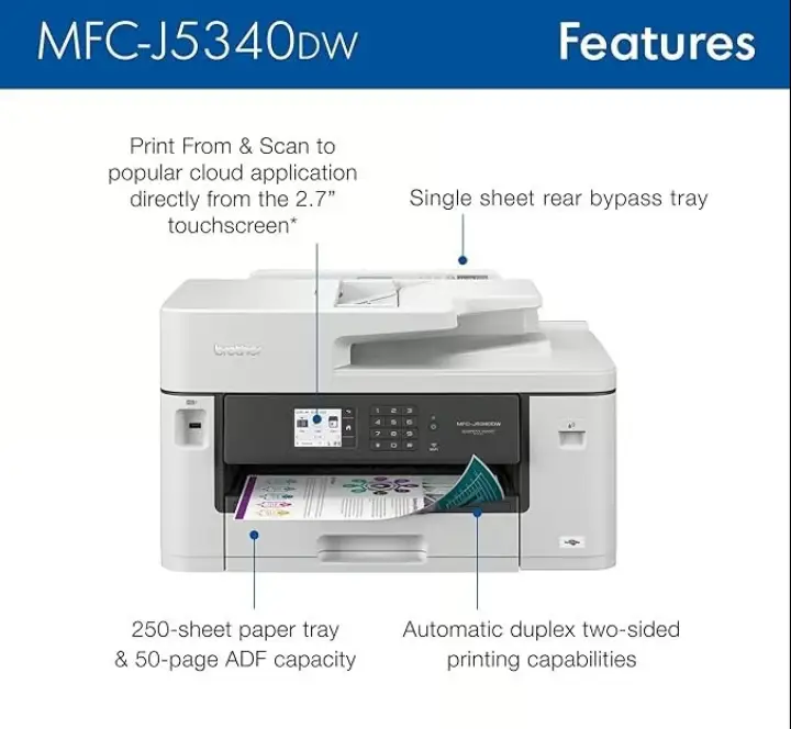 The MFC-J5340DW has several standout advantages, including fast print speeds of up to 22 pages per minute for black and 20 for color. Its high-yield ink cartridges reduce running costs, making it economical over time. The wireless and Ethernet connectivity provide flexible networking options for multiple users. Automatic duplex printing helps save paper and promotes environmentally responsible use. The 20-sheet ADF supports efficient batch scanning and copying. Additionally, it offers a compact design for space-saving placement on office desks.