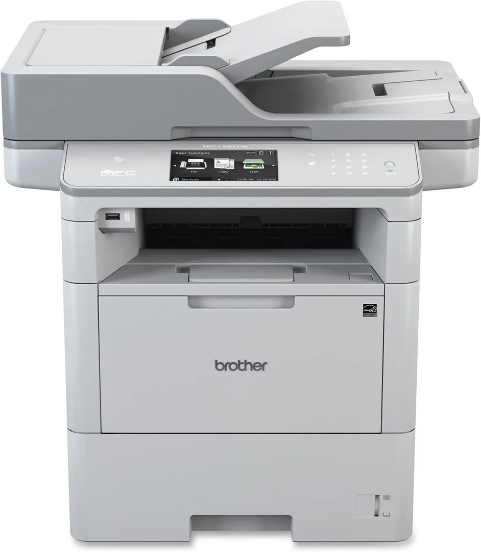 The Brother MFC-L6900DW is a high-performance monochrome laser multifunction printer designed for demanding office environments. It offers print, copy, scan, and fax functionalities integrated into a single device to optimize workspace efficiency. Equipped with a fast 1 GHz dual-core processor and 512 MB RAM, the device ensures smooth operation even with large print jobs. It supports high-speed printing at up to 52 pages per minute with resolutions up to 1200 x 1200 dpi, ensuring sharp and professional text output. The printer incorporates a 70-sheet automatic document feeder (ADF) capable of duplex scanning, enhancing productivity. Connectivity options include built-in wireless 802.11b/g/n, Ethernet, USB 2.0, and support for mobile printing protocols such as AirPrint and Google Cloud Print.