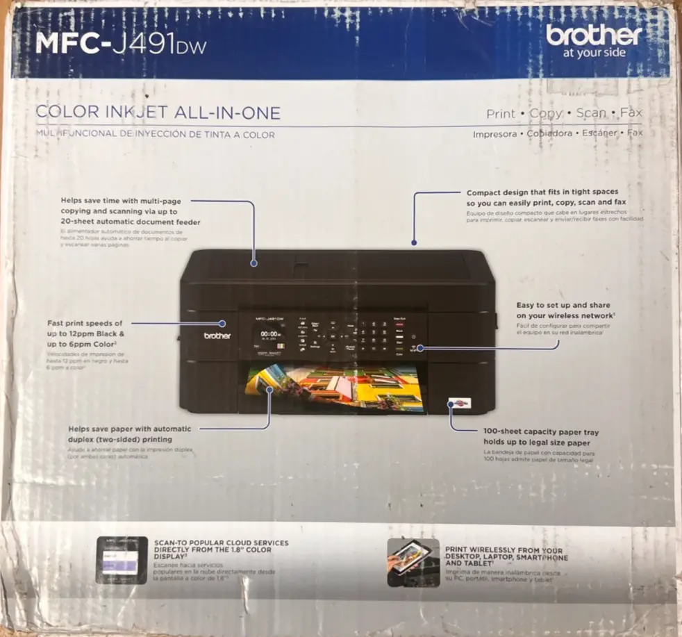 The Brother MFC-J491DW is known for its compact footprint making it suitable for limited office space. Wireless and wired connectivity options provide flexible integration into various network environments. Multifunction capabilities consolidate several office tasks into one device, increasing operational efficiency. The printer features automatic duplex printing which reduces paper usage and enhances productivity. High print resolution ensures professional-quality output for documents and images. Additionally, the inclusion of an automatic document feeder streamlines multi-page scanning and copying jobs, reducing manual intervention.