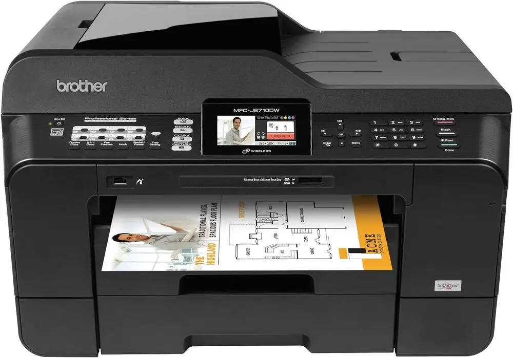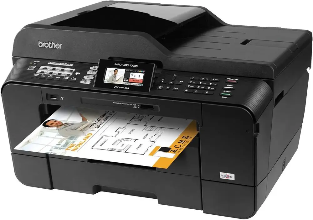 The Brother MFC-J6710DW is an all-in-one inkjet office device that supports printing, scanning, copying, and faxing functionalities. It integrates a four-ink cartridge system (cyan, magenta, yellow, black) with inkjet print technology for high-quality color and monochrome prints. The device supports A3-size printing with a maximum print resolution of up to 6000 x 1200 dpi enhanced. It features a flatbed scanner with an automatic document feeder (ADF) that can hold up to 20 sheets, allowing efficient handling of multi-page scanning and copying tasks. Connectivity options include USB 2.0, Ethernet, and Wi-Fi, enabling flexible network and direct device access. The control panel includes a color touchscreen interface, simplifying device operation and settings adjustments.