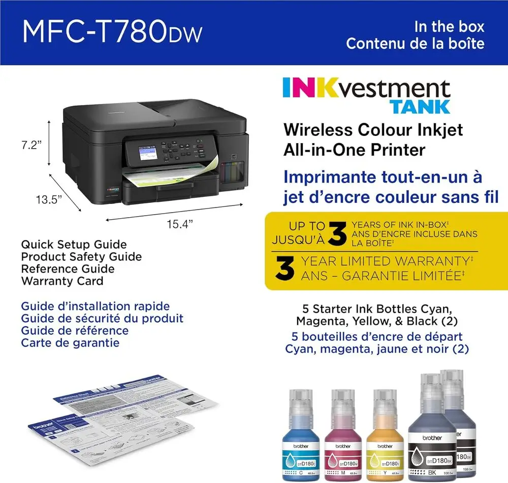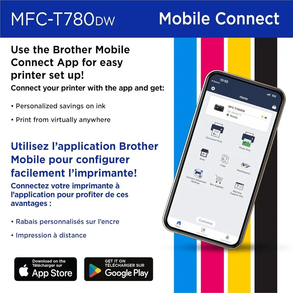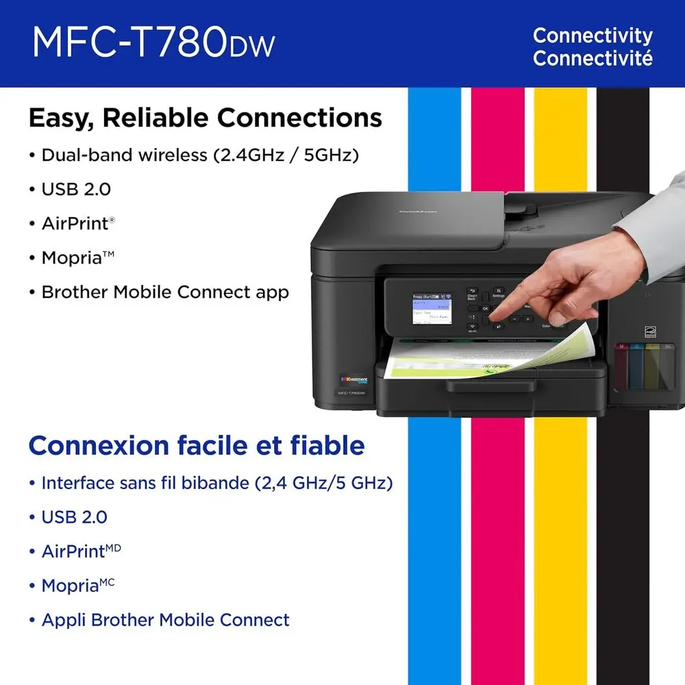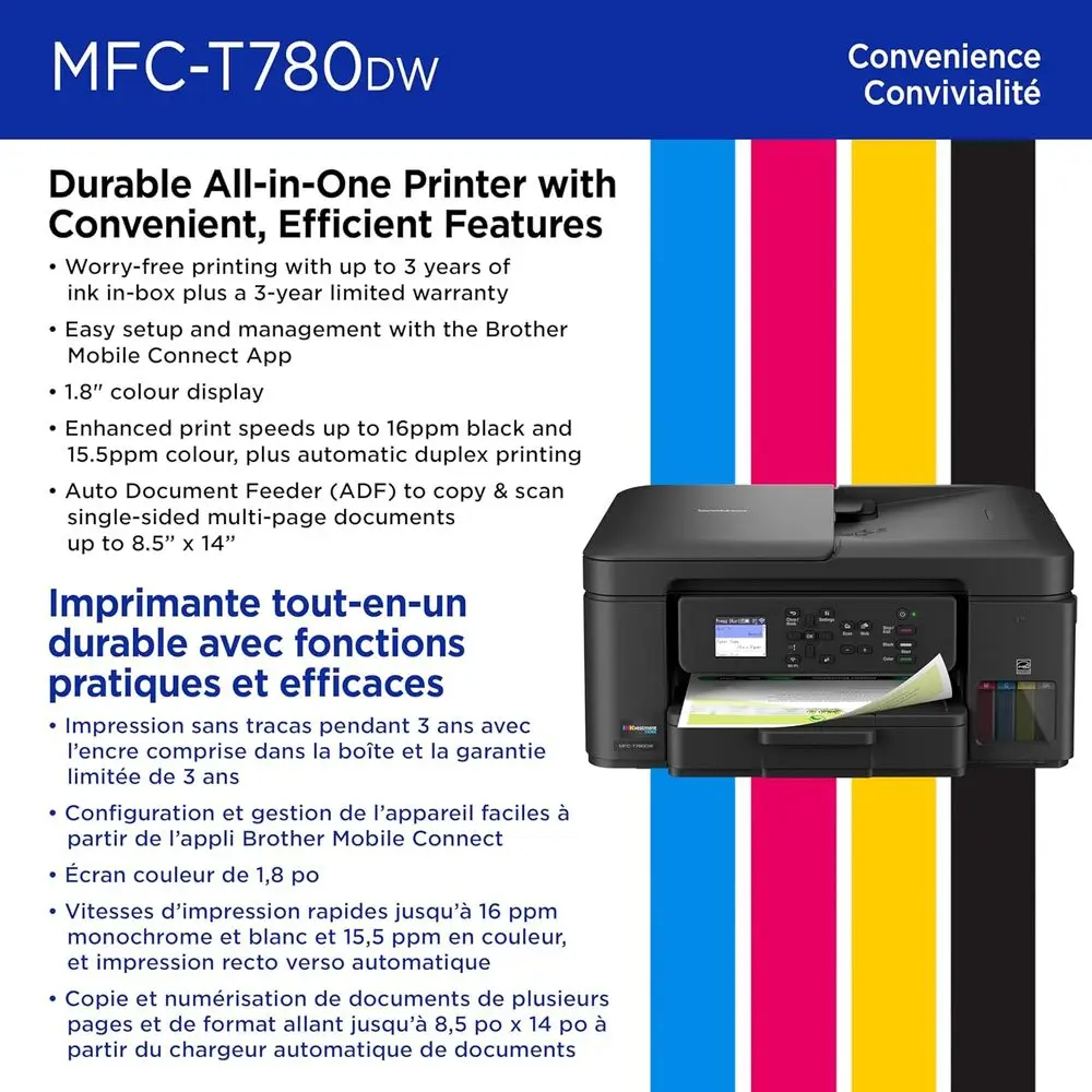 The Brother MFC-T780DW is an all-in-one inkjet printer designed for office use, combining printing, scanning, copying, and faxing functionalities. It supports wireless connectivity including Wi-Fi Direct and Ethernet, facilitating flexible printing options from multiple devices. The printer delivers high-resolution printing up to 1200 x 6000 dpi, leveraging INKvestment Tank technology for high ink capacity and cost-effective page yield. It features a 250-sheet paper tray and supports various media types and sizes, enhancing versatility. Its automatic duplex printing supports double-sided jobs to save paper, while the built-in automatic document feeder accommodates multi-page scanning and copying. The device includes a 2.7-inch color touchscreen for intuitive user interfacing and easy operation.