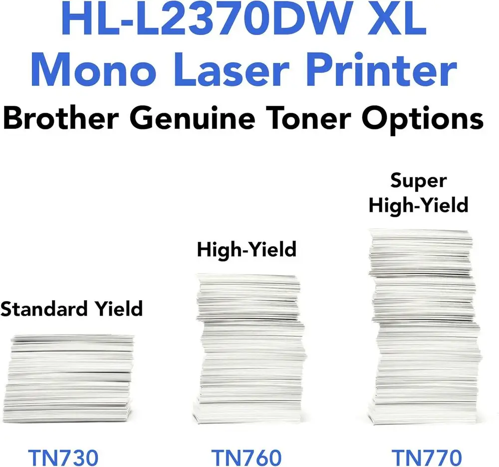 Included Components | Brother HLL2370DWXL, TN760 (3,000 page yield est), TN770 (4,500 page yield est), DR730 Drum (12,000 page yield est), Quick set up guide, Installation CD-ROM (MAC OS available from download links), AC power cord |