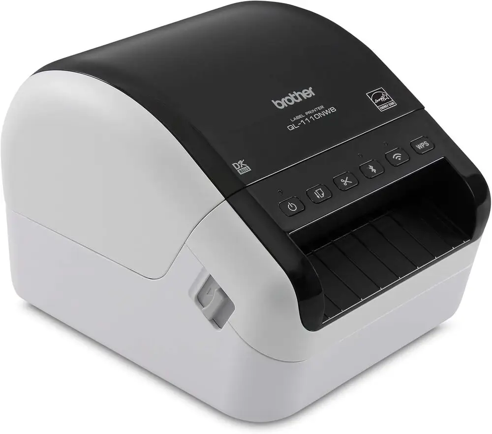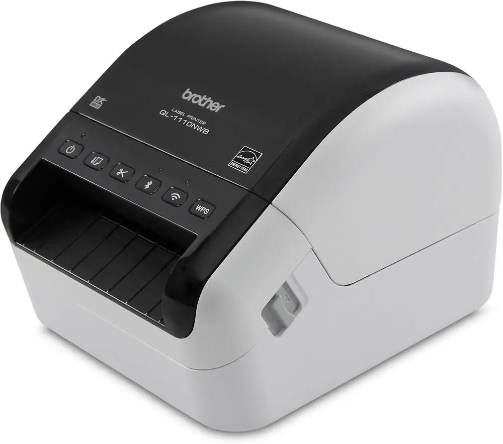 The Brother QL1110NWB is a high-performance label printer designed for professional use, offering wide-format printing up to 4 inches. It supports multiple connectivity options including USB, Ethernet, Wi-Fi, and Bluetooth, facilitating versatile deployment in office environments. The device uses direct thermal printing technology, eliminating the need for ink or toner and enabling faster label production. It can print labels with resolutions up to 300 dpi, ensuring sharp text and graphics suitable for barcodes and detailed logos. The device supports continuous and pre-sized labels, enhancing flexibility for varied labeling applications. Integrating seamlessly with Windows and Mac operating systems, it is compatible with P-touch Editor software for customized label design.