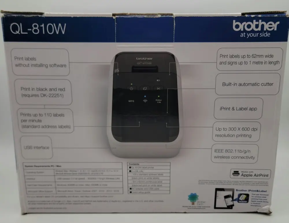Included Components | Brother QL810W Label Printer, P-touch editor software and driver, AC power adapter, USB cable, DK1201 and DK2251 starter rolls |