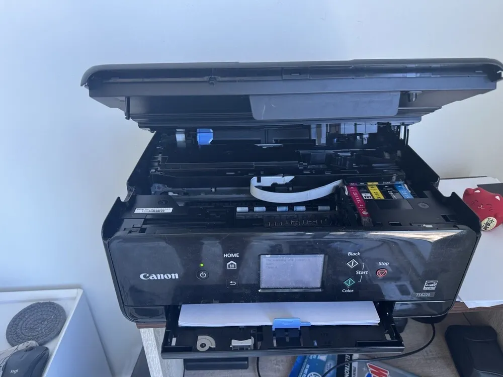 The printer is somewhat bulky compared to newer models with more integrated design efficiency.