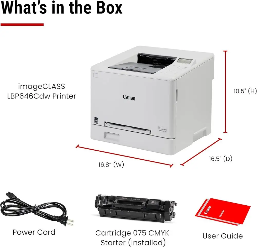 Included Components | Canon Genuine Toner 075 CMYK Starter: 500 Yield CMY, 700 Yield Black, Documentation, Power Cord, imageCLASS LBP646Cdw Printer |