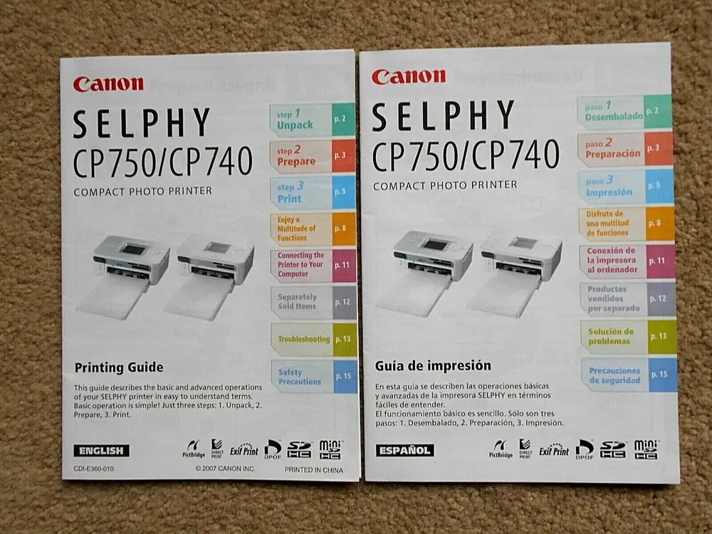 The Canon Selphy CP740 is a compact dye-sublimation photo printer designed for quick and high-quality photo printing. It utilizes Canon's dye-sublimation technology with a resolution of up to 300 x 300 dpi. The device supports various print sizes including 10 x 15 cm (4 x 6 inch) and features a built-in LCD screen for previewing images before printing. The CP740 connects via USB 2.0 for fast data transfer and supports printing directly from memory cards such as CompactFlash, SmartMedia, and SD cards. Equipped with a dedicated dye-sublimation color ribbon and paper kit, it delivers durable prints with vibrant colors and smooth gradations.