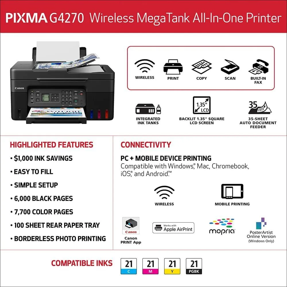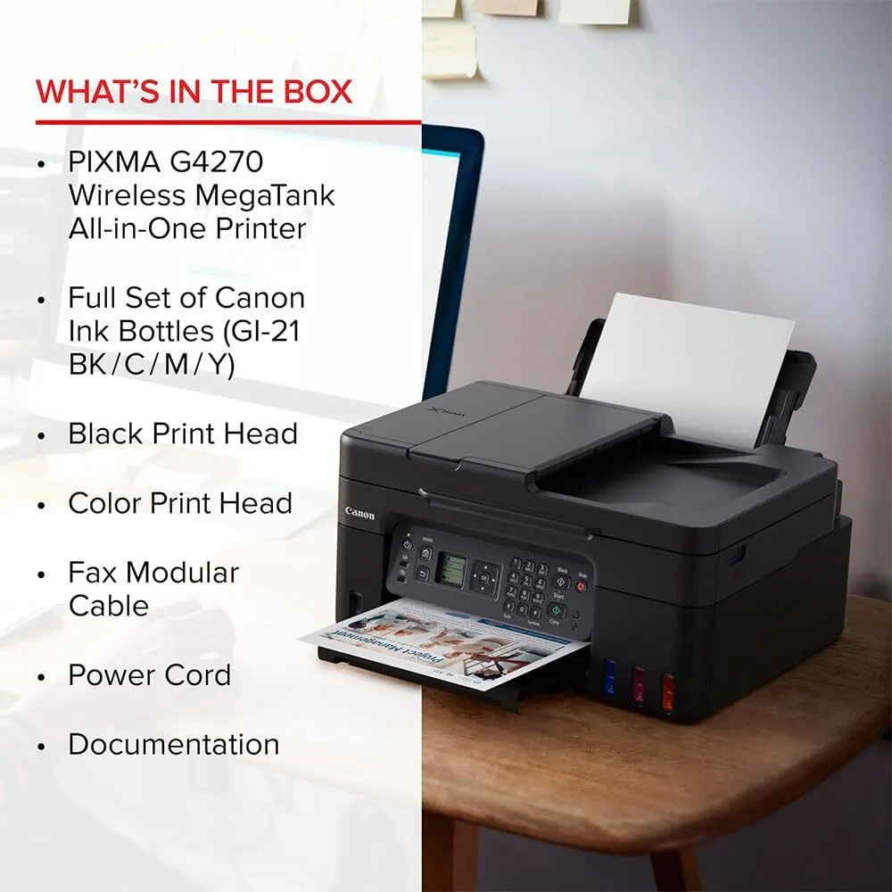 | Included Components | PIXMA MegaTank G4270 Wireless All-in-One Printer | Set of Ink Bottles (GI-21: PGBK, C, M, Y) | Print Heads | Fax Modular Cable | Documentation & Power Cord |