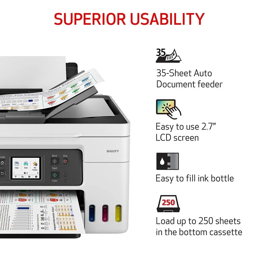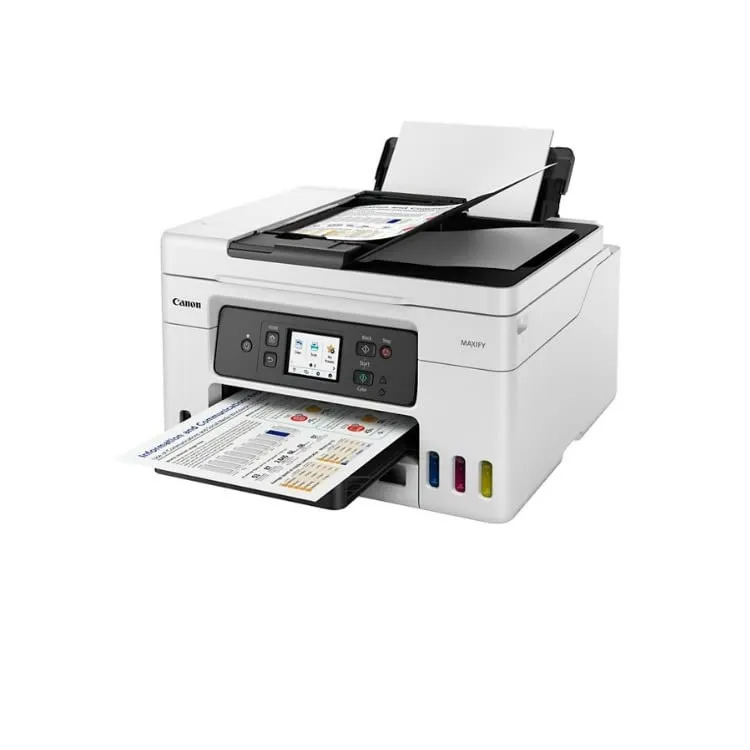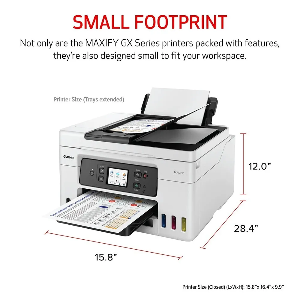 The Canon Maxify GX4020 offers high print volume at a low cost per page due to its refillable ink tank system, which outperforms traditional cartridges in economy. Its compact footprint suits small office environments without sacrificing functionality. Wireless connectivity options facilitate convenient mobile and remote printing solutions. The device delivers consistent quality prints quickly, ideal for business document needs. Automatic duplex printing helps reduce paper consumption and operational costs. Additionally, the multifunction capability with copying and scanning adds versatility within a single device.