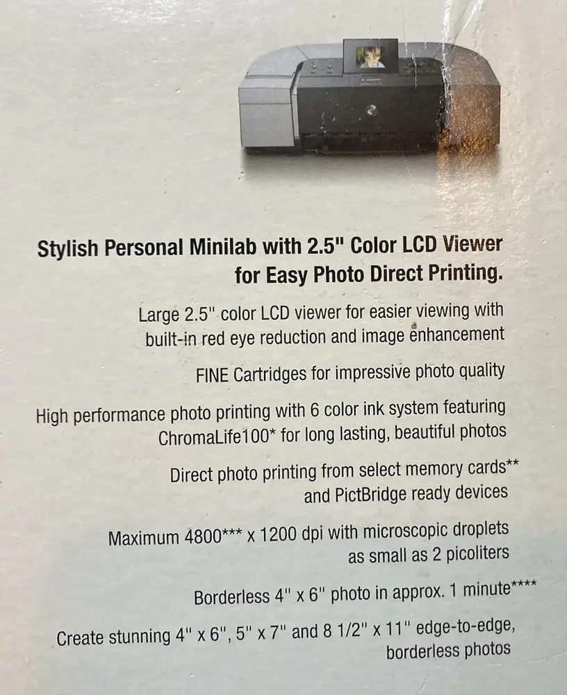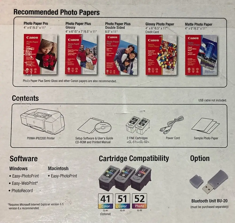 The PIXMA iP6220D features Six ChromaLife100 ink cartridges for vibrant and long-lasting prints. It achieves high-resolution printing, up to 9600 x 2400 dpi, which delivers sharp and detailed images. Borderless photo printing is supported up to 8.5 x 11 inches, making it ideal for photo enthusiasts. Compact size makes it suitable for limited desktop space in offices or homes. It supports multiple media types including photo paper, plain paper, and envelopes. The individual ink system allows cost-efficient replacement by only changing used colors.