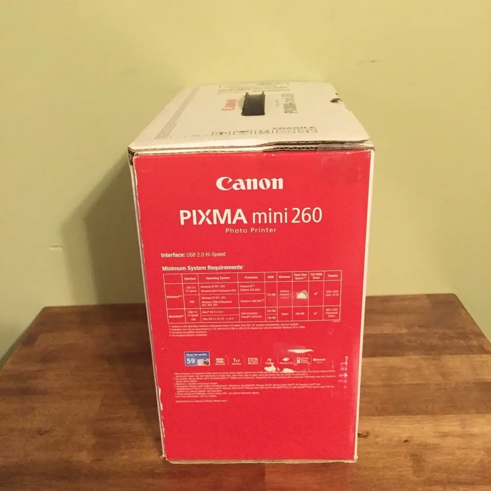 The Canon Pixma Mini 260 is a compact portable photo printer designed primarily for mobile use and instant photo printing. It features advanced Canon FINE (Full-photolithography Inkjet Nozzle Engineering) print head technology, which enables high-resolution photo output up to 300 x 300 dpi with dye-based inks for vivid color reproduction.