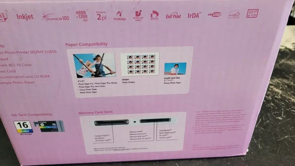 | Supported Media Sizes | 4x6 inches (Postcard), 2.1x3.4 inches (Credit Card), others |