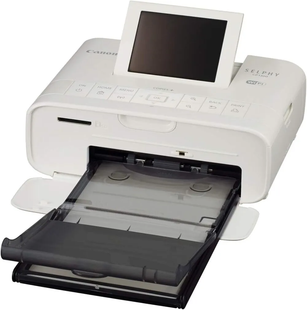 The Canon SELPHY CP1300 is a compact, portable dye-sublimation photo printer designed for high-quality photo printing. It supports borderless prints in various sizes, including 4x6 inches, providing excellent color reproduction with a maximum resolution of 300 x 300 dpi using dye-sublimation technology. The printer includes built-in Wi-Fi connectivity, allowing wireless photo printing from smartphones, tablets, and computers via Canon's PRINT app and Apple AirPrint. It supports multiple input sources such as USB drives, SD/SDHC cards, and direct computer connection via USB 2.0. Powered by a dye-sublimation system, the printing process involves sequential layers of color; this provides professional-quality prints with durable and water-resistant finishes. The device features a 3.2-inch tilt-type LCD screen for easy operation and previewing images before printing.