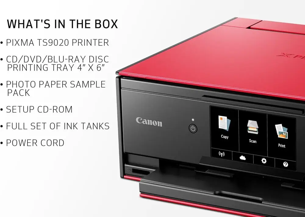 Included Components | 4"x6" Photo Paper Sample Pack (3 Sheets PP-301), CD/DVD/Blu-ray Disc Printing Tray, Full Set of Ink Tanks, PIXMA TS9020 Wireless Inkjet All-In-One Printer, Power Cord, Setup CD-ROM |