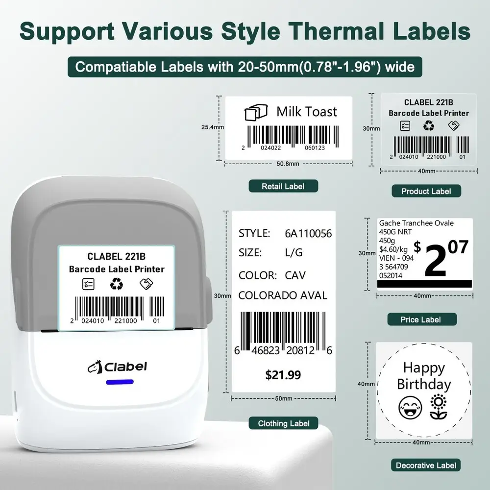 The CLABEL 221B supports thermal transfer and direct thermal labels in various materials including paper and synthetic options compatible with barcode and text printing.