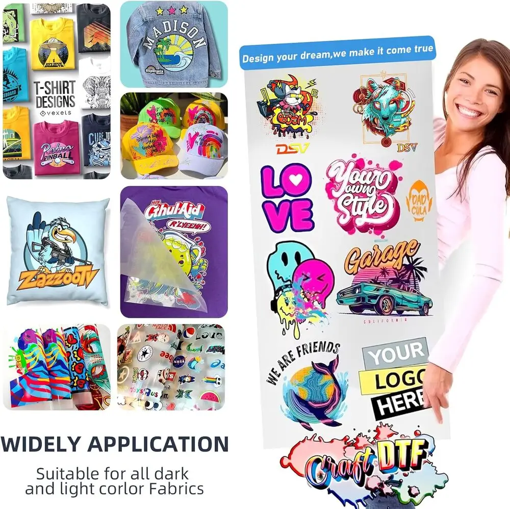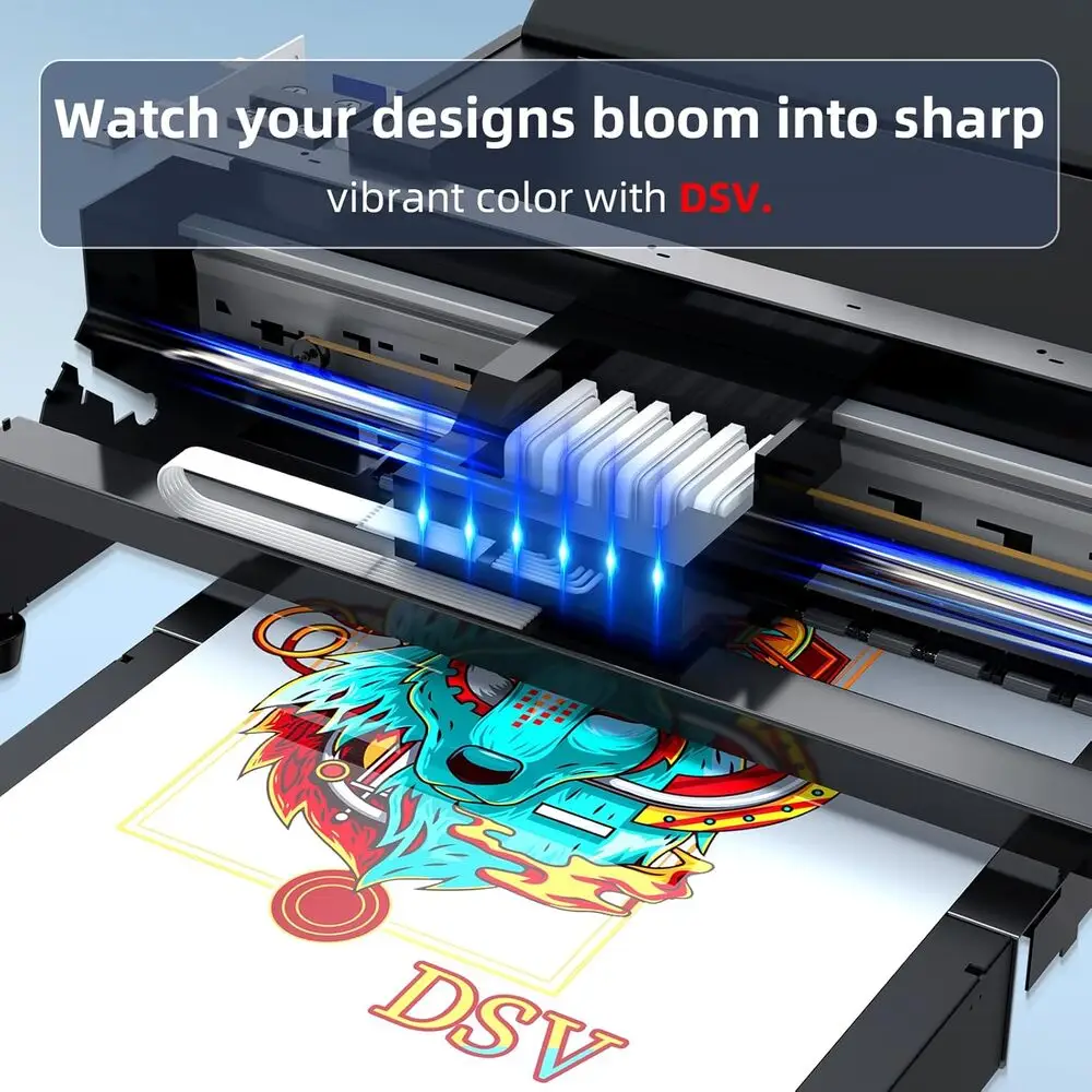 The DSV L1800 DTF Printer is engineered with advanced piezoelectric printhead technology, delivering superior print resolution up to 1440 x 720 dpi for precise and vivid designs. It utilizes Direct to Film (DTF) printing technology, enabling direct transfer of images onto various textile types through a durable adhesive powder process. The printer supports a wide color gamut with its CMYK plus white ink system, enhancing the vibrancy and opacity on dark fabrics.